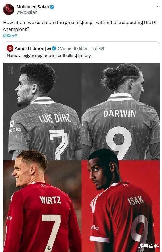 实际上,利物浦队内并非只有斯洛特一人对球队的夏窗操作感到不满。萨拉赫也曾在社交媒体上隐晦地表达过自己的不满。赛季初,利物浦球迷账号AnfieldEdition发布了一张图片,将离队的努涅斯、迪亚斯与新援维尔茨、伊萨克并列,并配文:“足坛历史上还有比这更重磅的升级吗?”