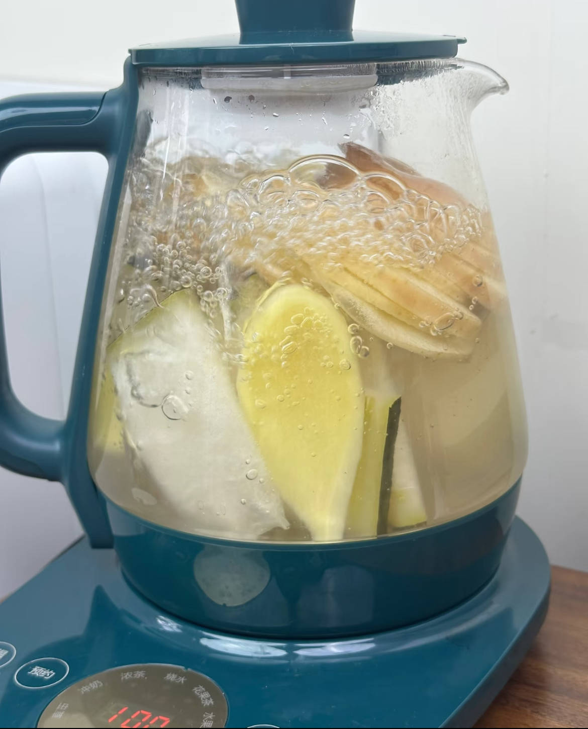2、把所有切好的食材全都放养生壶里,加入足量的清水,慢慢煮上20分钟左右就可以了。