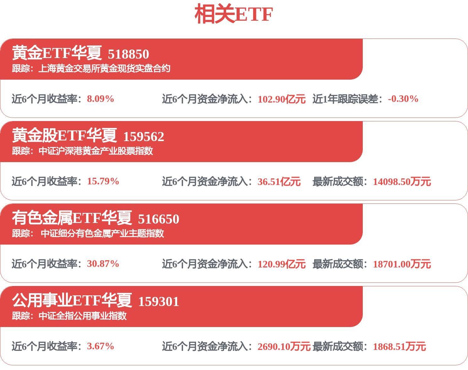 黄金股ETF华夏(159562,联接021074/021075)紧密跟踪中证沪深港黄金产业股票指数,指数覆盖黄金开采、加工、销售全产业链,其中金属与采矿行业占比超9成,直接受益金价上涨。因金矿开采成本刚性,金价上涨带动利润增长,叠加金矿公司产量扩张,业绩增速远超金价涨幅,因此黄金股弹性显著高于金价。