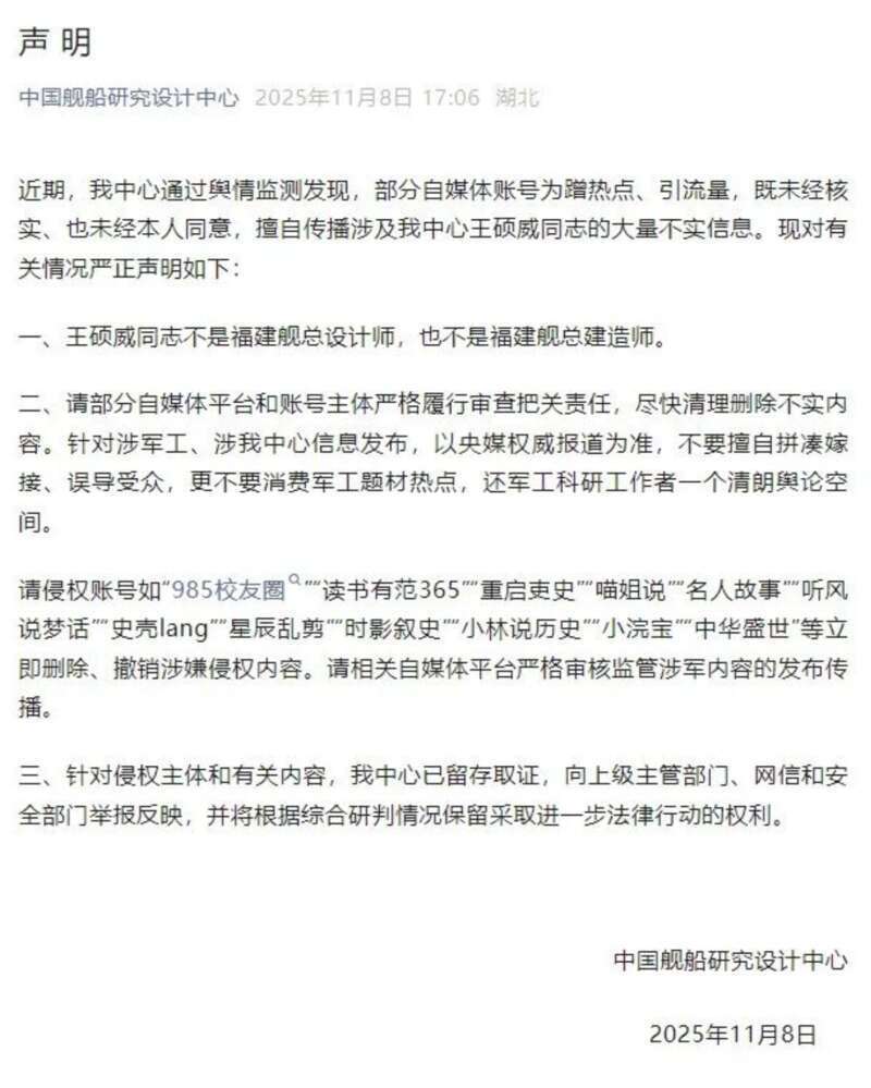 中国舰船研究设计中心11月8日发布声明。声明称,近期该中心通过舆情监测发现,部分自媒体账号为蹭热点、引流量,既未经核实、也未经本人同意,擅自传播涉及中国舰船研究设计中心王硕威同志的大量不实信息。